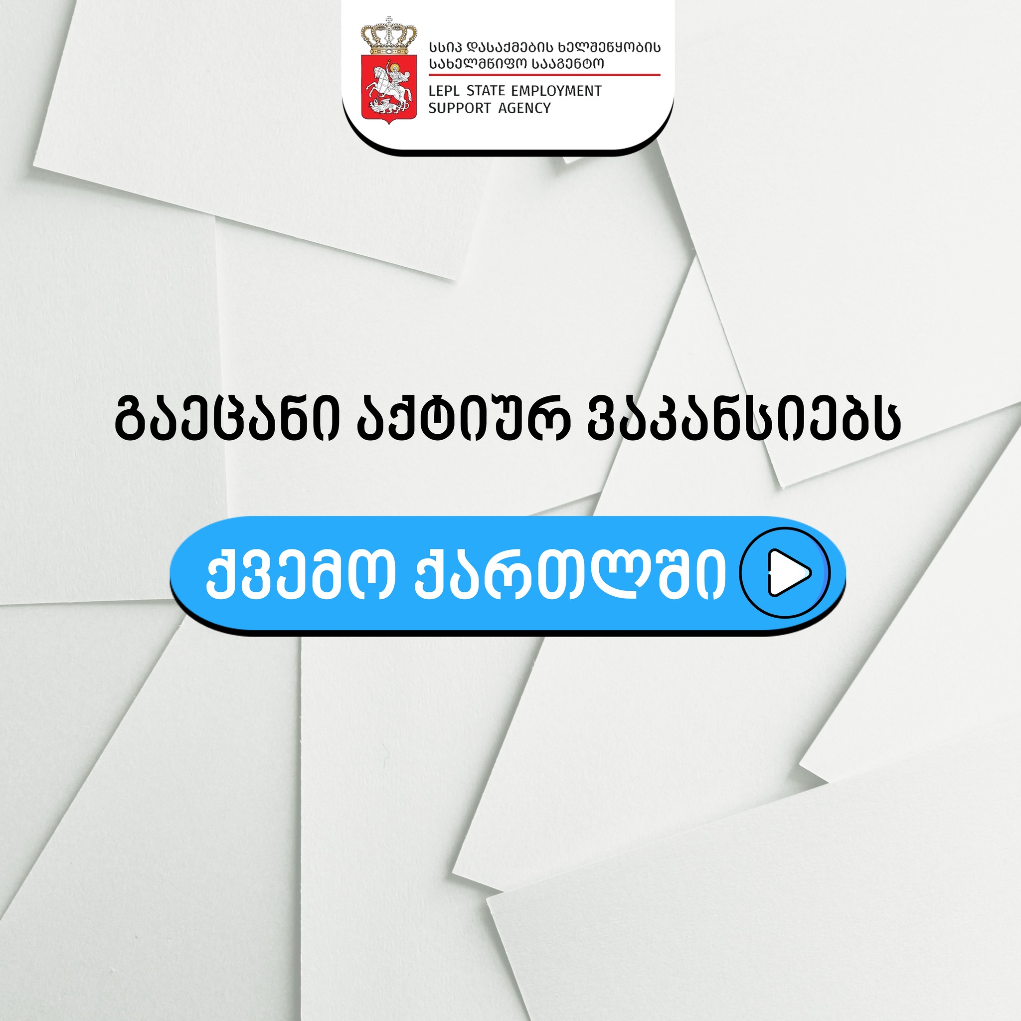 დასაქმების ხელშეწყობის სახელმწიფო სააგენტო გიზიარებთ მიმდინარე კვირის აქტიურ ვაკანსიებს, ქვემო ქართლში
