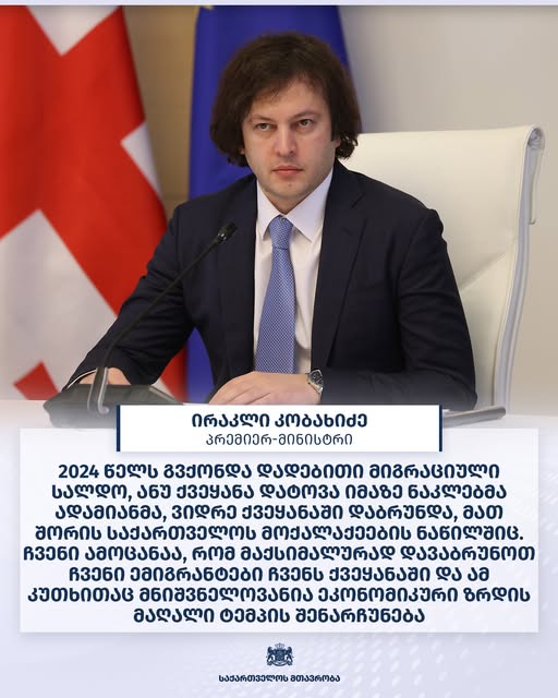 ირაკლი კობახიძე – 2024 წელს გვქონდა დადებითი მიგრაციული სალდო, ანუ ქვეყანა დატოვა იმაზე ნაკლებმა ადამიანმა, ვიდრე ქვეყანაში დაბრუნდა, მათ შორის საქართველოს მოქალაქეების ნაწილშიც.ჩვენი ამოცანაა, რომ მაქსიმალურად დავაბრუნოთ ჩვენი ემიგრანტები ჩვენს ქვეყანაში და ამ კუთხითაც მნიშვნელოვანია ეკონომიკური ზრდის მაღალი ტემპის შენარჩუნება