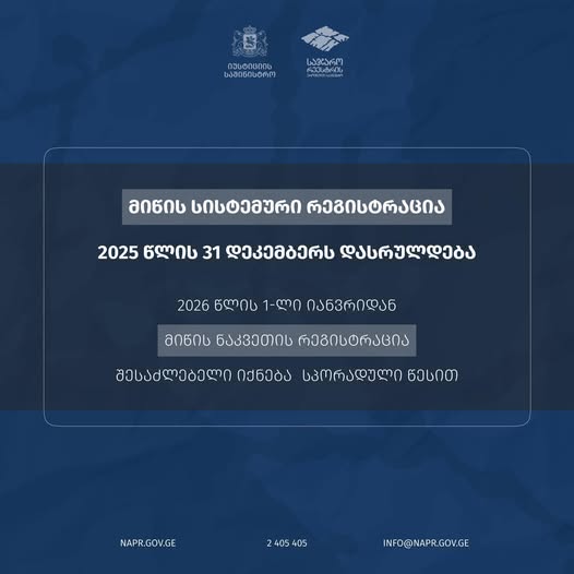 მიწის სისტემური რეგისტრაციის რეფორმა, რომელსაც იუსტიციის სამინისტროს საჯარო რეესტრის ეროვნული სააგენტო 2022 წლიდან ახორციელებს, 2026 წლის 1 იანვარს სრულდება.