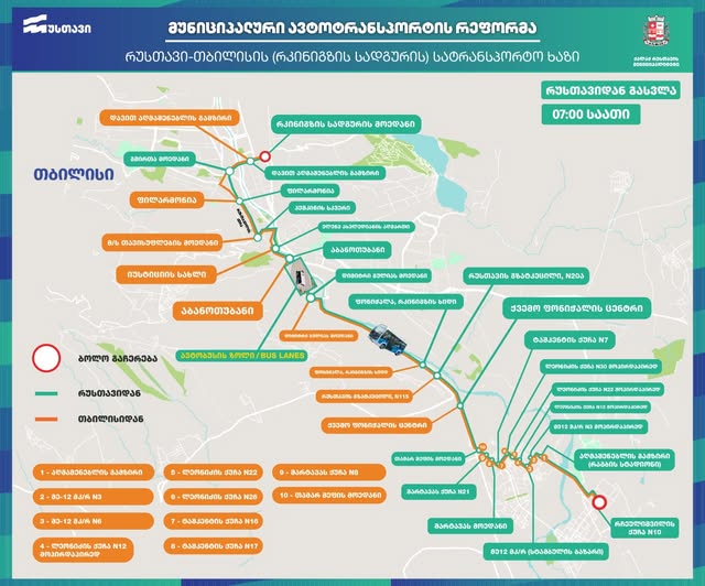 პირველად რუსთავში, რუსთავი-თბილისის სატრანსპორტო ხაზზე, მუნიციპალური ტრანსპორტი, ჭყონდიდელის სახელობის უბნიდან (რჩეულიშვილის N 10) იმოძრავებს და მგზავრებს რკინიგზის სადგურამდე გადაიყვანს