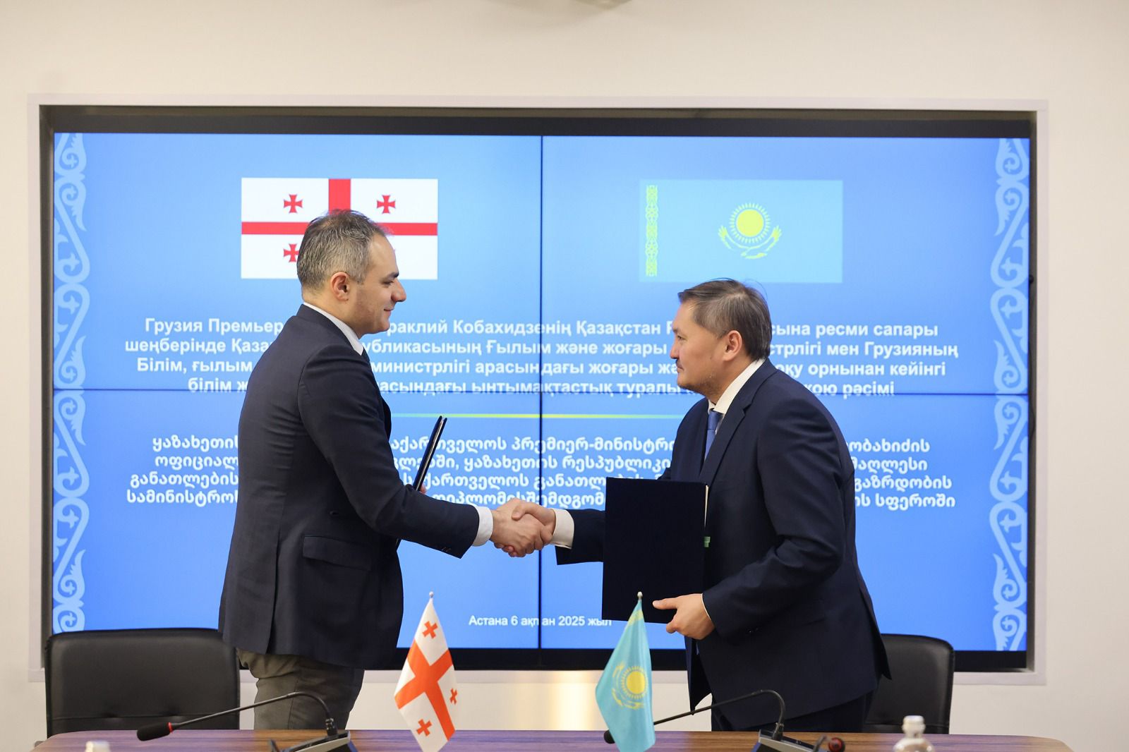 შეხვედრაზე მინისტრებმა ხელი მოაწერეს თანამშრომლობის მემორანდუმს, რომელიც საქართველოსა და ყაზახეთის რესპუბლიკას შორის უმაღლესი განათლებისა და მეცნიერების სფეროებში პარტნიორობის გაძლიერებას გულისხმობს.