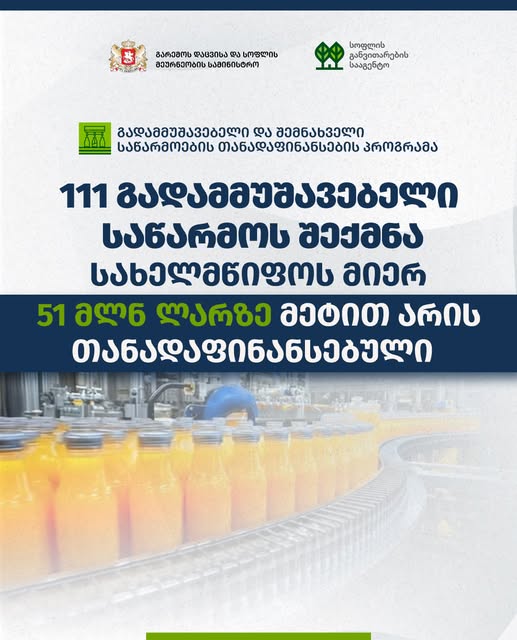 ამ მიზნისთვის მოქმედებს სპეციალური პროგრამა – „გადამმუშავებელი და შემნახველი საწარმოების თანადაფინანსება“, რომლის ფარგლებში მთელი საქართველოს მასშტაბით უკვე 111 საწარმო შეიქმნა.