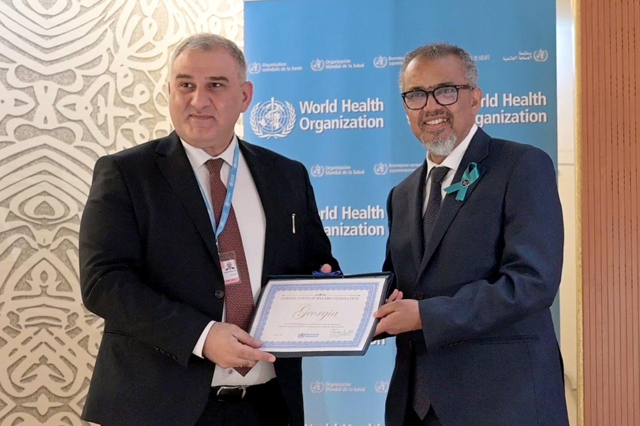 ჟენევაში, ასამბლეის გახსნის ღონისძიებაზე, ჯანმო-ს გენერალურმა დირექტორმა, საქართველოს ჯანდაცვის მინისტრს, მალარიისგან თავისუფალი ქვეყნის სტატუსის მოპოვებისთვის, სერტიფიკატი გადასცა. ჯანმრთელობის მსოფლიო ორგანიზაციამ საქართველო მალარიისგან თავისუფალ ქვეყნად 2025 წლის დასაწყისში გამოაცხადა.