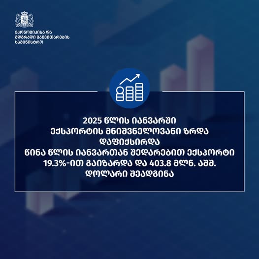 2025 წლის იანვარში ექსპორტის მნიშვნელოვანი ზრდა დაფიქსირდა. წინა წლის იანვართან შედარებით ექსპორტი 19.3 პროცენტით გაიზარდა და 403.8 მლნ. აშშ. დოლარი შეადგინა