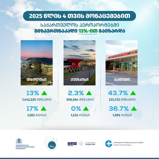 2025 წლის იანვარ-აპრილში საქართველოს საერთაშორისო აეროპორტებში მგზავრთნაკადი, წინა წლის ანალოგიურ პერიოდთან შედარებით, 13%-ით გაიზარდა და 2,182,811 მგზავრი შეადგინა