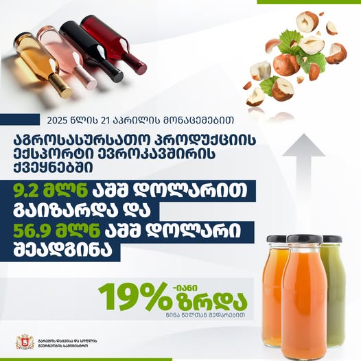 2025 წლის 21 აპრილის მონაცემებით, აგროსასურსათო პროდუქციის ექსპორტი ევროკავშირის ქვეყნებში 19%-ით, 9.2 მლნ აშშ დოლარით გაიზარდა და 56.9 მლნ აშშ დოლარს მიაღწია