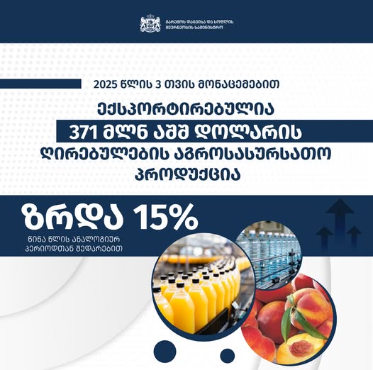 2025 წლის 3 თვის მდგომარეობით, საქართველოდან ექსპორტირებულია 371 მლნ აშშ დოლარის ღირებულების აგროსასურსათო პროდუქცია, რაც 1,5%-ით აღემატება 2024 წლის ანალოგიური პერიოდის მაჩვენებელს