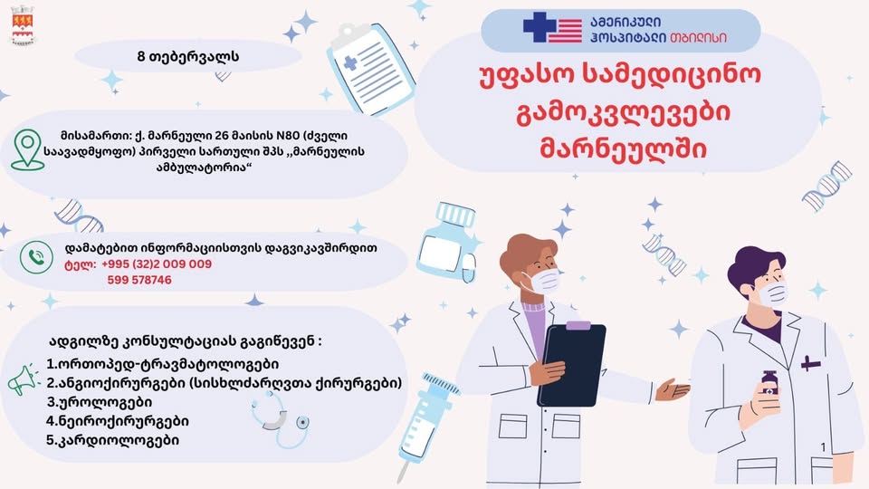 2025 წლის 8 თებერვალს, შაბათს მარნეულის მუნიციპალიტეტში ,,ამერიკული ჰოსპიტალის თბილისისა”და მარნეულის საკრებულოს ერთობლივი საქველმოქმედო პროექტის ფარგლებში უფასო სამედიცინო გამოკვლევები ჩატარდება
