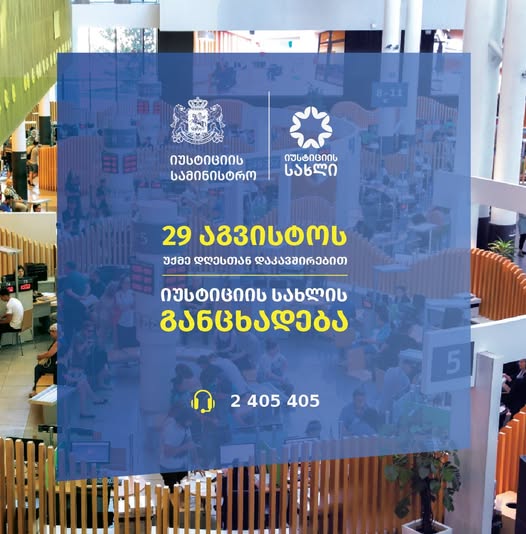 გაცნობებთ, რომ 29 აგვისტოს გამოცხადებულ უქმე დღეს თბილისის ცენტრალური, ბათუმის №1 და ქუთაისის იუსტიციის სახლები 09:00 საათიდან 18:00 საათამდე დახურულ რეჟიმში, დაჩქარებულ სერვისებზე იმუშავებენ.